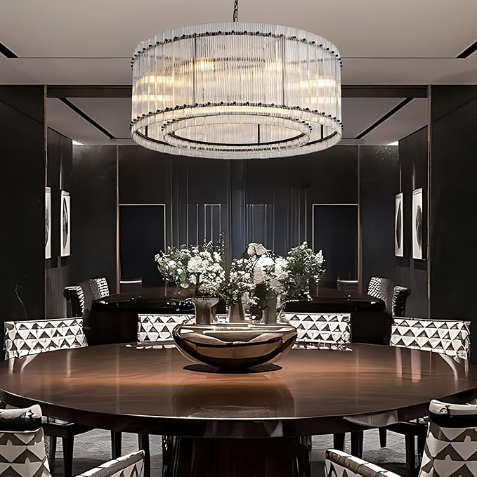 37'' Black Chandelier Fixture, Doule Layer Drum Pendant Lighting