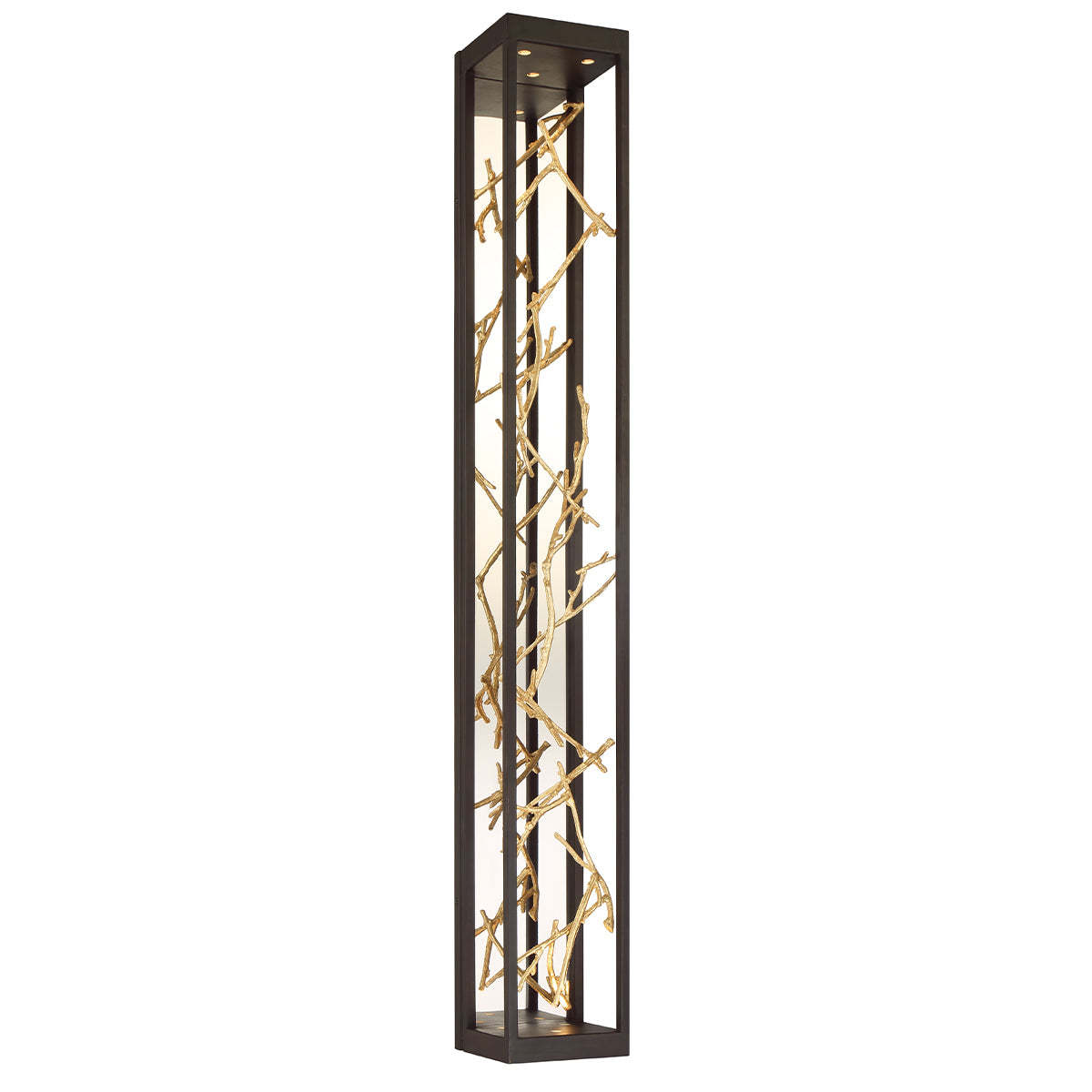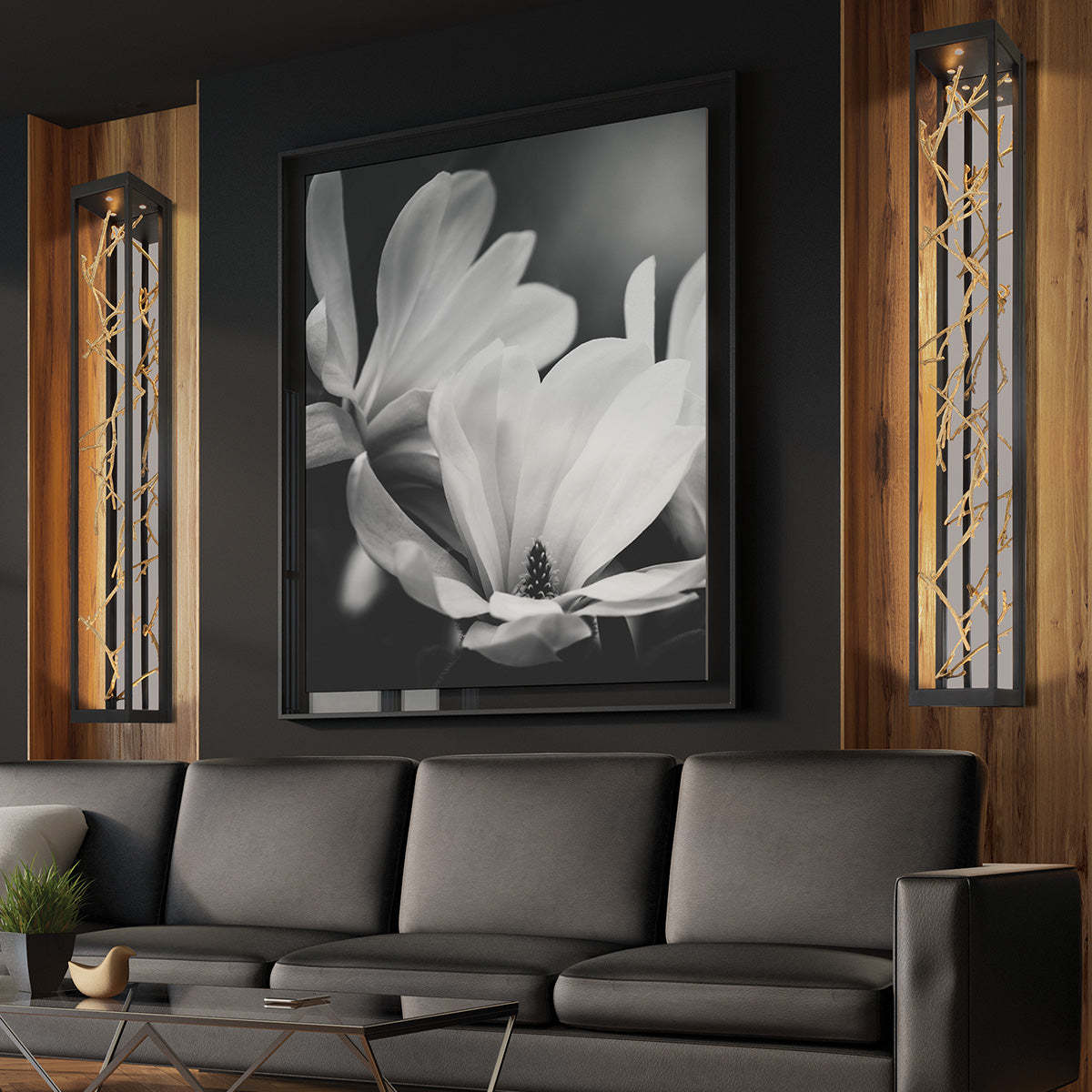 The Aerie Wall Sconce features handcrafted, free-flowing branches. This cast brass structure resembles a picture frame, highlighting the artistic elements within with its crisp edges. The branch elements are handcrafted with a familiar organic movement and depth of detail. When the switch is flipped, soft ambient light shines on the metal surface of the branch, giving it a warm hue that makes the branch seem to float in the air.