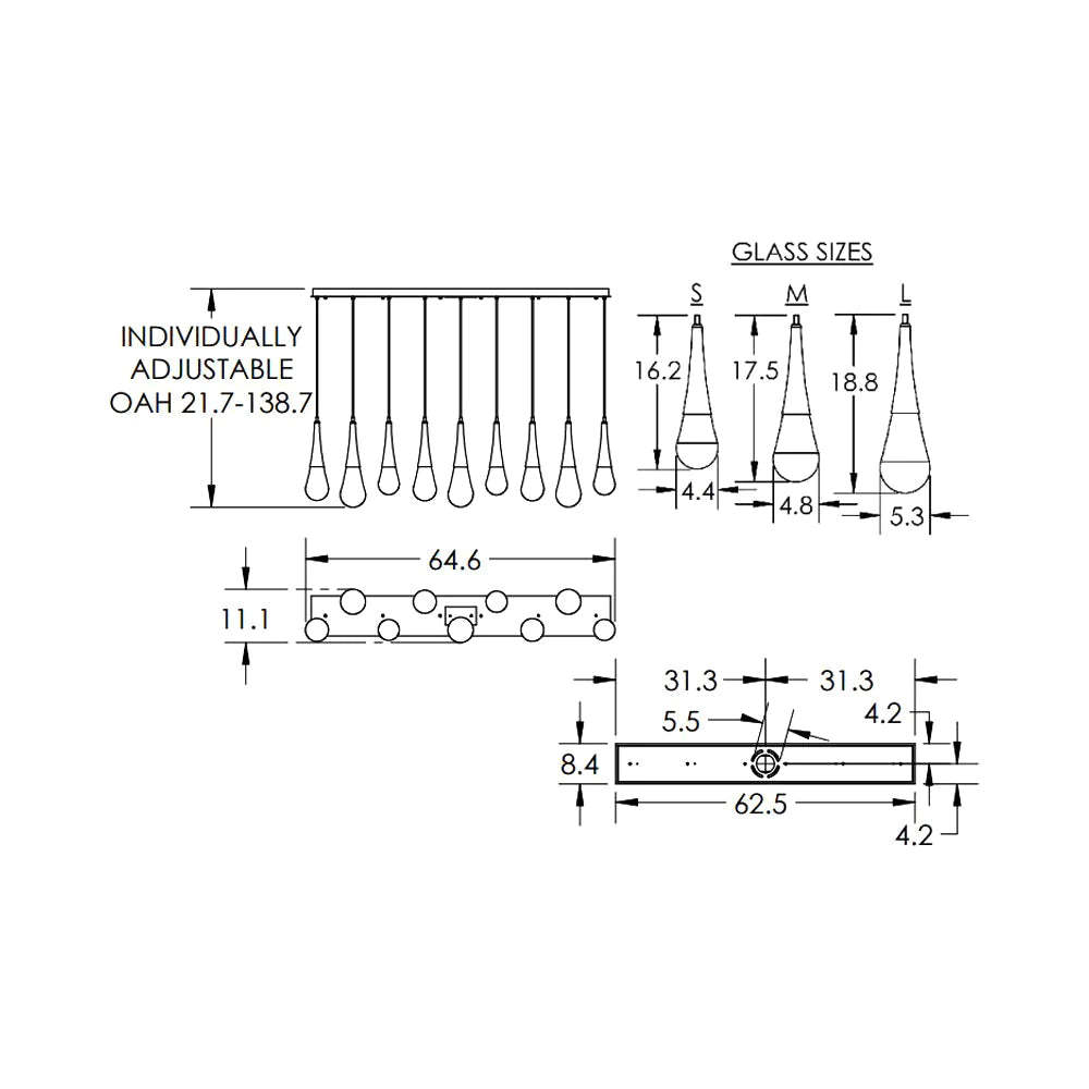 9-Light: 64.6″W X 21.7″H; 138.7″ max height