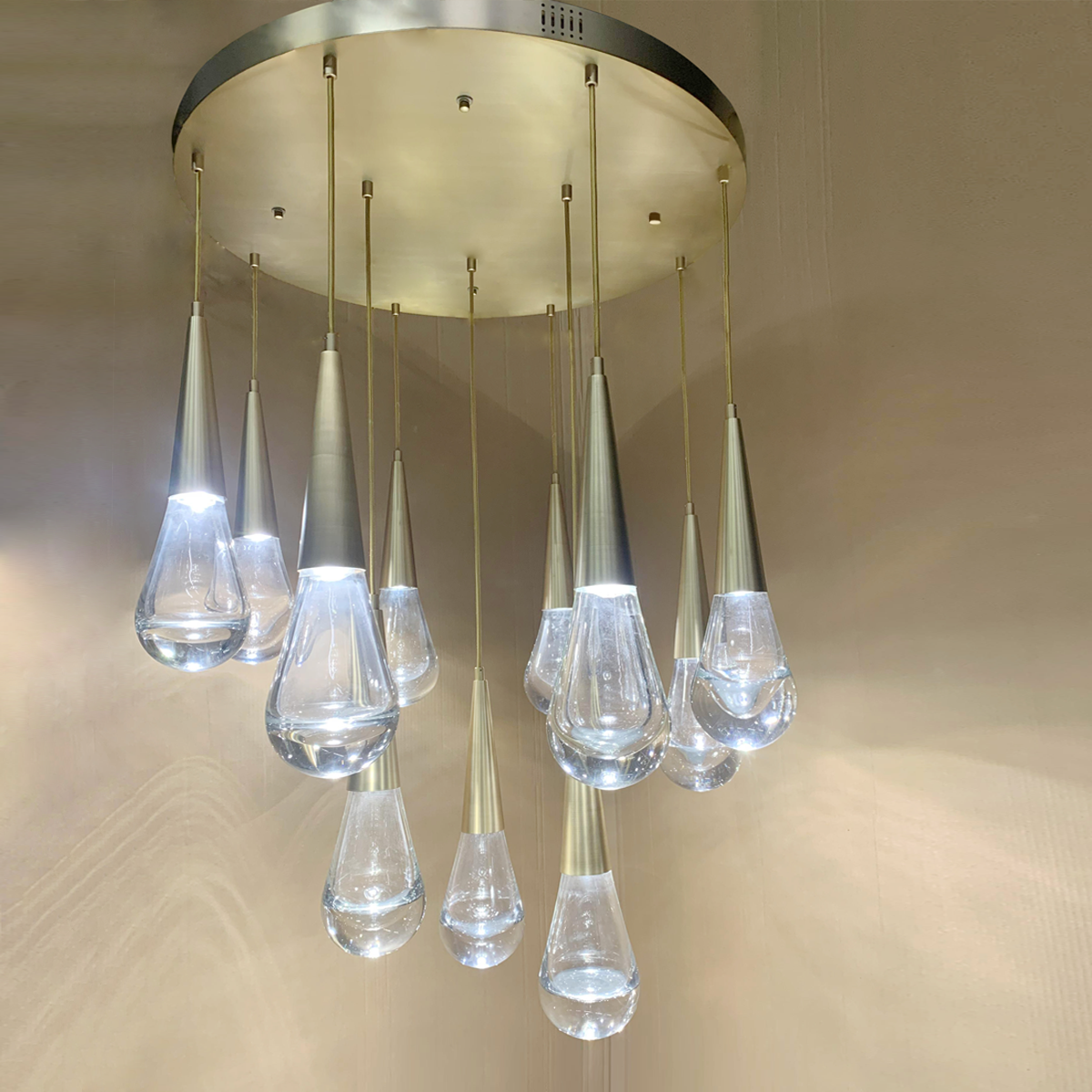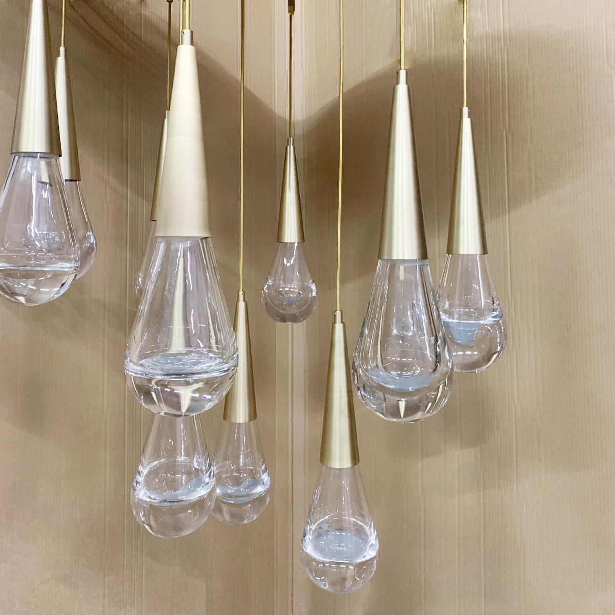 Each clear raindrop pendant is handmade, highlighting the artistic atmosphere. Each raindrop pendant is carefully blown and polished by workers with many years of manual experience. The fittings are made of solid brass with high surface finish and exquisite workmanship. Perfect presentation of this lighting, high-quality technology and high-quality materials. Highlight the artistic atmosphere.